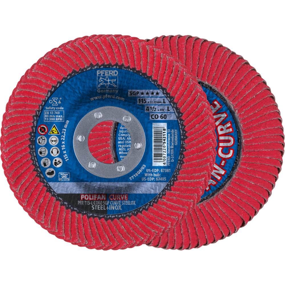 PFERD’s range of POLIFAN Flap Discs are manufactured and tested in accordance with the strictest quality requirements. As a founding member of the Organisation for Safety of Abrasives, PFERD is committed to conform to tougher inspection requirements which even goes beyond international recognised EN 13743 safety standards.