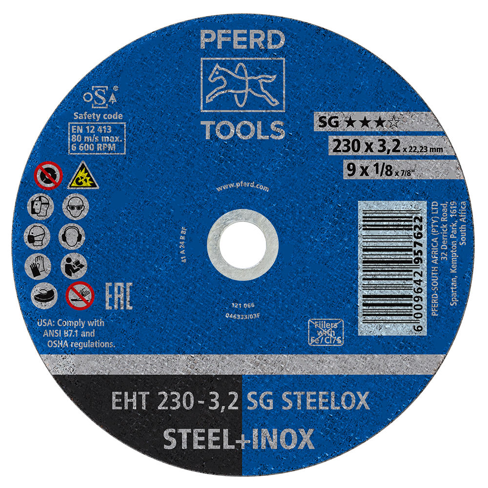 The €œSG STEELOX€ range of cutting discs from PFERD offer a very high cutting performance combined with a very long tool life. PFERD's focus on speed, safety, comfort, and overall superior cutting performance makes it the ideal cut-off wheel for various steel and stainless steel (INOX) applications.